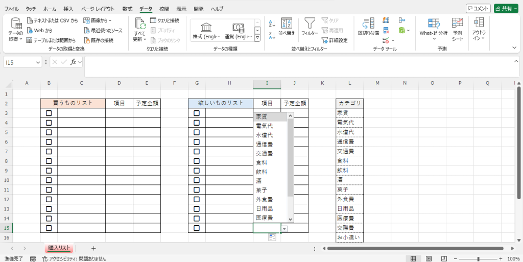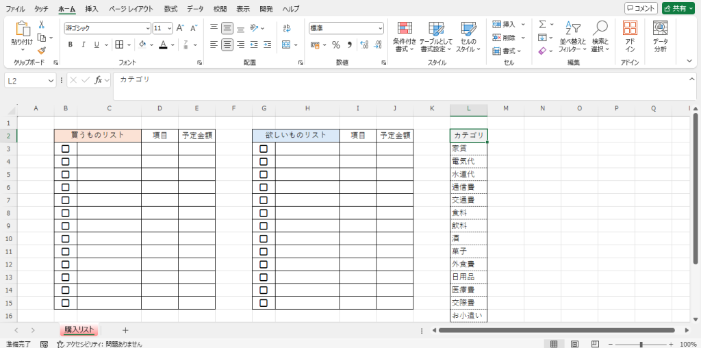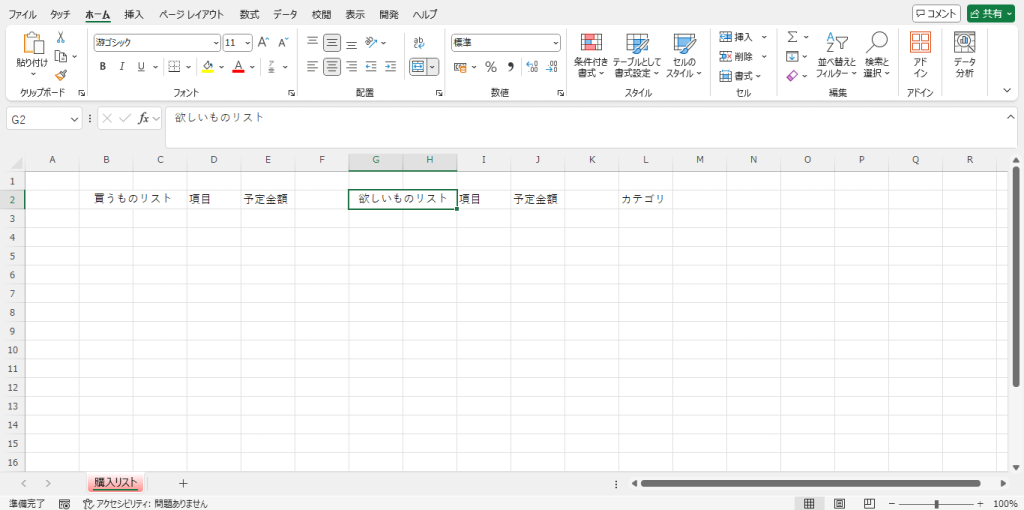 また、G2「欲しいものリスト」、I2「予定金額」、L2「カテゴリ」と入力します。
