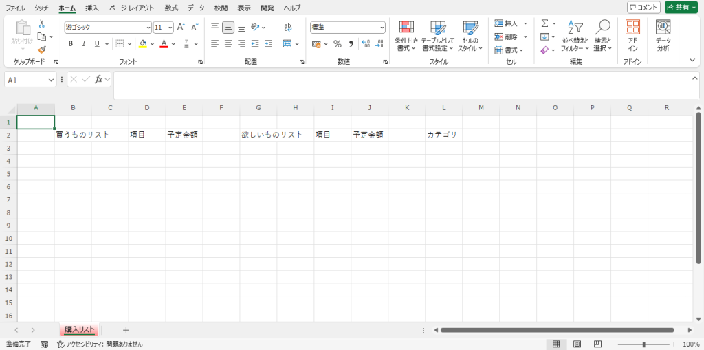 セル番号B2に「買うものリスト」、D2「項目」、E2「予定金額」