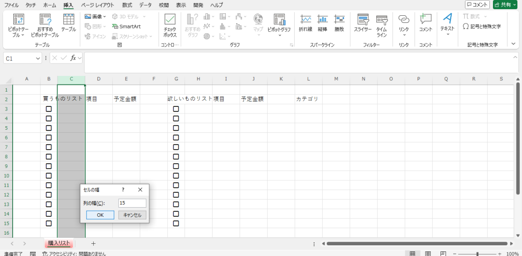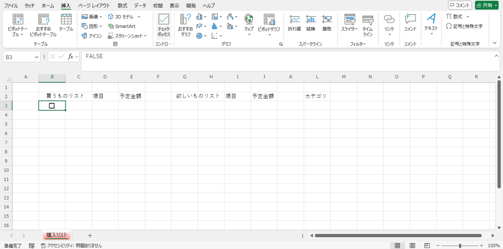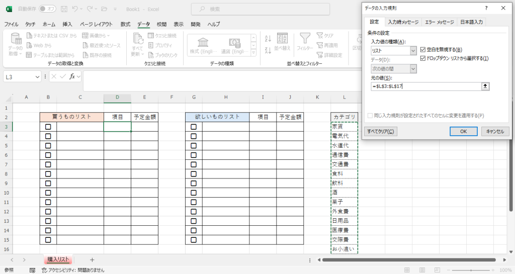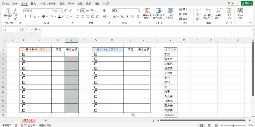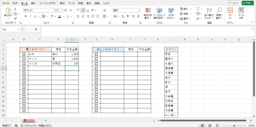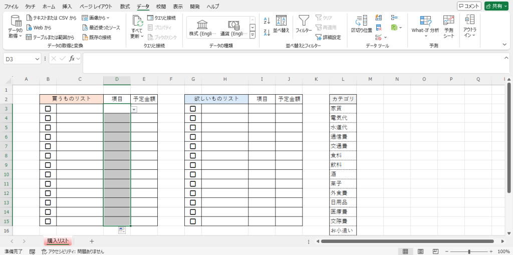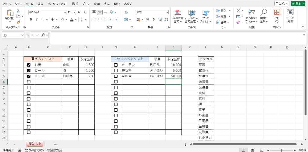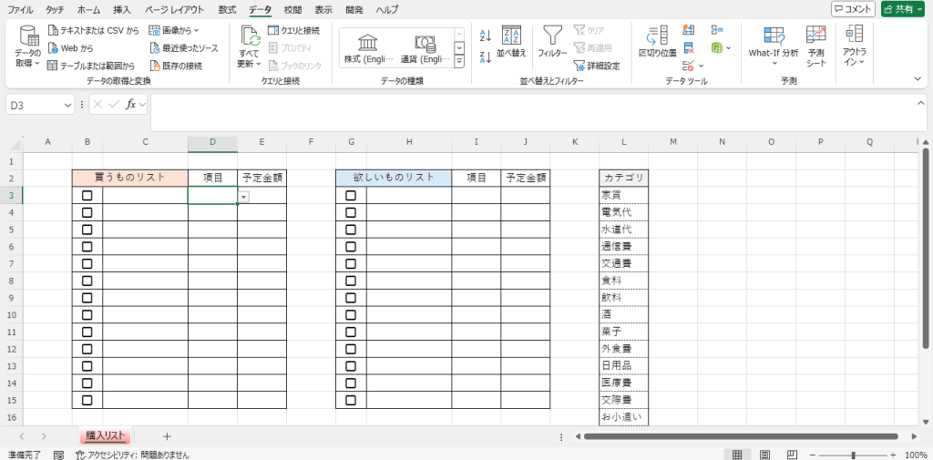 以上、今回は「購入リストシート」を作成しました。列の幅や色、カテゴリなどは自分が使いやすいようにカスタムしてみてください。