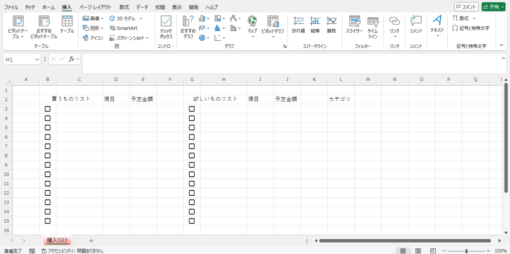 「欲しいものリスト」も同様、H2のセルと結合させます。