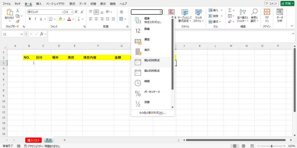 「日付」は、短い日付形式を選択しました。ここは、皆さんの好みで設定してください。