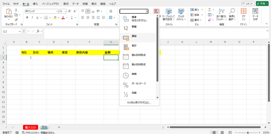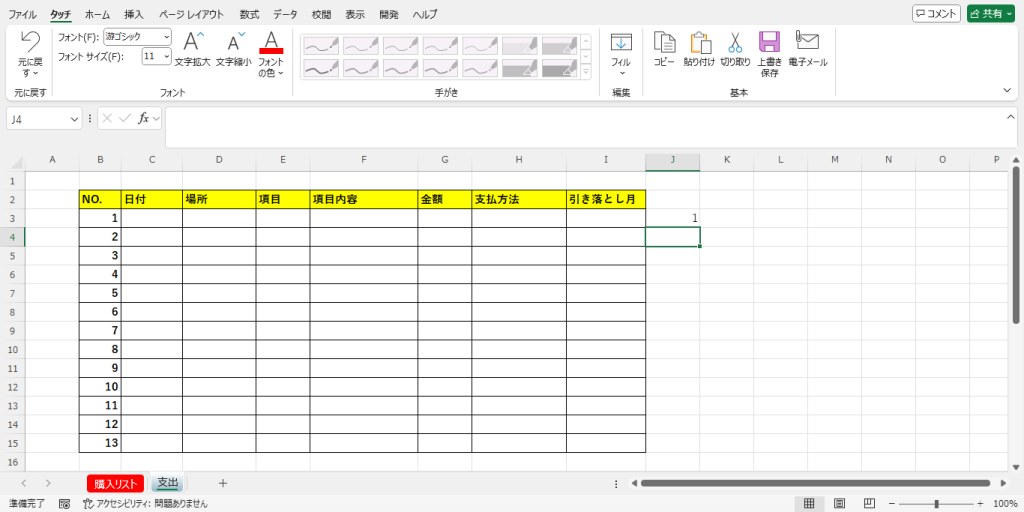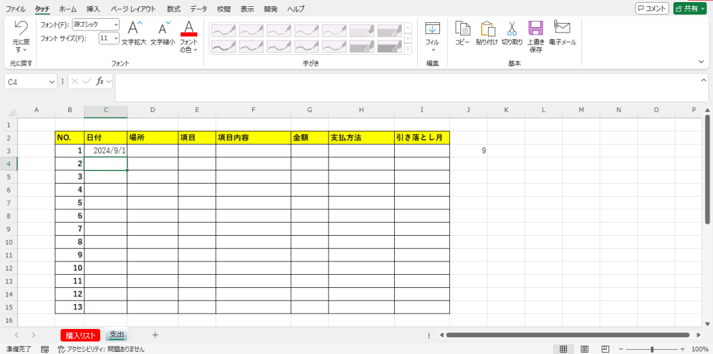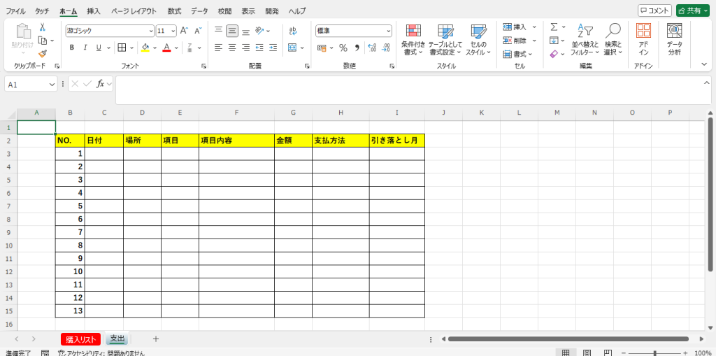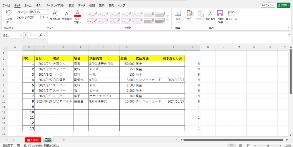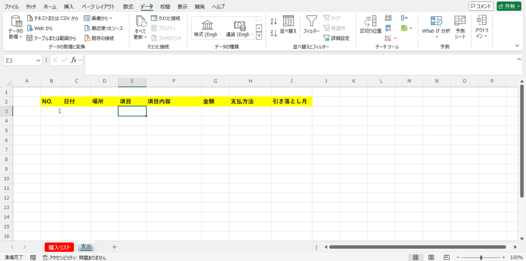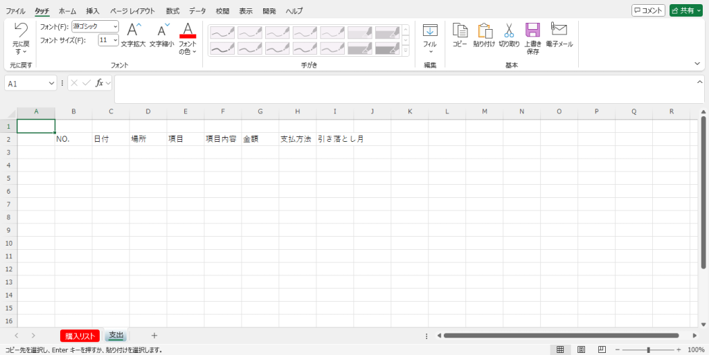 前回作成した「購入リスト」と同じエクセルに「支出」シートを作成します。