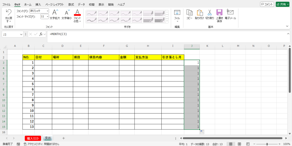 つぎにJ列に、日付の「月」だけを抽出する関数を入れていきます。