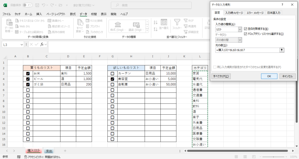 「データ入力規則」から、「入力値の種類」を”リスト”に変更し、「元の値」を購入リストのカテゴリにします。