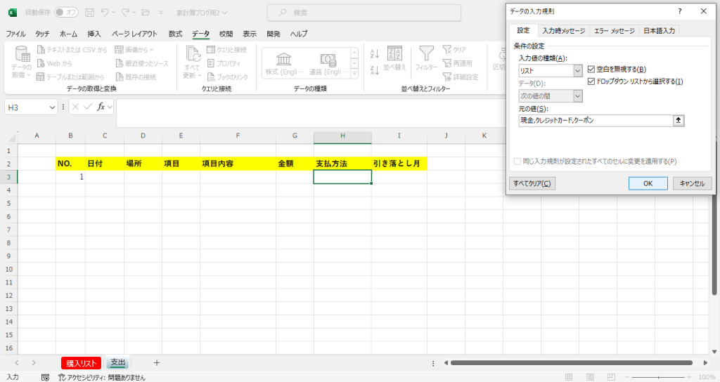 「支払方法」は、「データ入力規則」から、「入力値の種類」を”リスト”に変更し、「現金,クレジットカード, クーポン」と入力しました。口座振替など別の支払方法がある場合は、加えてください。
